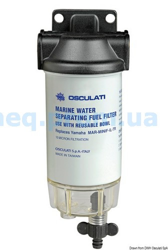 Фільтр паливний з водороздільники. Рекомендується для двигунів до 200 л/с. Еквівалент Yamaha 2W-114-00-00. Наявність штуцера під шланг ø 8 мм і швидкою системою зливу конденсату. Головка - алюміній. Прозорий корпус. Пропускна здатність на тиску - 0,49 PSI - 200л/ч. Пропускна здатність тиску на 1,47 PSI - 316 л/ч. Пропускна здатність тиску на 2,45 PSI - 406 л/ч. Загальна висота 230 мм Виліт 90 мм. Різьблення картриджа 13/16". Змінний стакан для води 17.661.32. Змінний фільтруючий картридж 10 мкм 17.661.31. 2 шт. штуцерів на 8 мм - в комплекті.