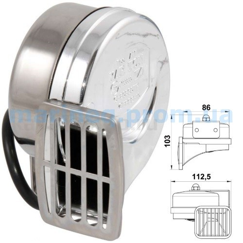 Горн мембранний, одинарний. Матеріал корпусу: хромований АБС-пластик. Матеріал кронштейна - нержавіюча сталь дзеркальної поліровки. Рівень звуку - 115 ± 5 дБ. Тон звуку - низькочастотний. Живлення 12 В / 8 А.