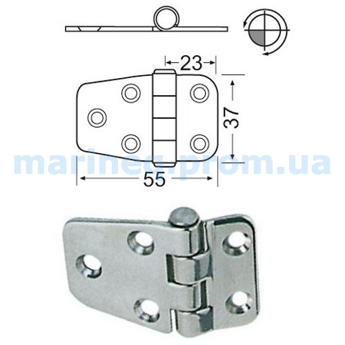 Петля. Матеріал - нержавіюча сталь. Грабаритные розміри: 55x37 мм, товщина 2 мм Модель - універсальна.