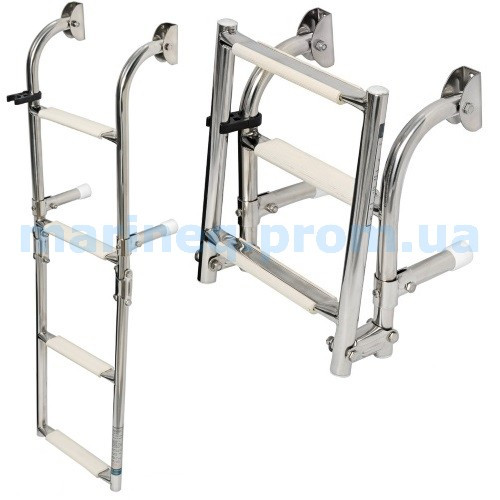 Трап розкладний. Виконаний з нержавіючої сталі для кріплення на кормовій частині. Модель зі сходами з овальною поверхнею. Овальна сходинка є більш зручною у використанні порівняно з традиційними заокругленими сходами. На верхній стороні, сходинки покриті антиковзною пластмасової майданчиком. На 4 ступені. Габаритні розміри: довжина - 90 див, ширина - 26 см, міжосьова відстань - 24 див. interax 24